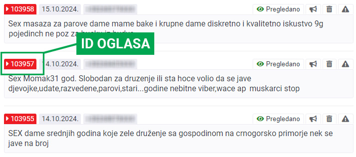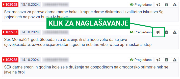 Ako ste pristupili našem sajtu preko računara, za postavljanje i naglašavanje oglasa morate da koristite mobilni telefon. Da bi se oglas pravilno naglasio, potrebno je da ukucate ključnu reč SEX, zatim reč NAGLASI i da na kraju dodate ID vašeg oglasa. Primer: SEX NAGLASI 103957 - samo ovako poslat SMS na broj 14741 će naglasiti, odnosno boldovati vaš oglas. U poruci za naglašavanje ne upisuje se broj telefona. Takva poruka neće imati nikakvog efekta, a biće naplaćena.